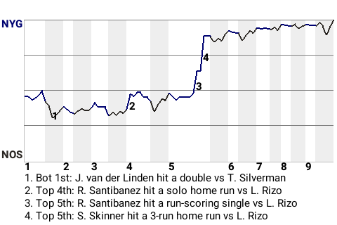New York used the hitting of Ricardo Santibanez to pick up the win. The right fielder clubbed a run-scoring single in the top of the fifth inning to put the Giants on top, 2-1. For the game, Santibanez had 1 home run and 1 single in 3 at-bats.