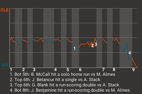 Jacksonville took a 2-1 lead on Josh Benjamine's 7th double of the season. The run-scoring double, which Benjamine hit in the bottom of the eighth, left Cleveland pitcher Mark Almes visibly frustrated.