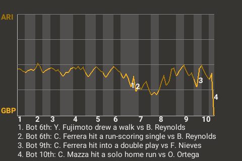 Green Bay got a knockout punch from Craig Mazza. The pinch hitter hammered a solo home run in the bottom of the tenth inning to win the game. It might've been his only hit, but it decided the outcome.