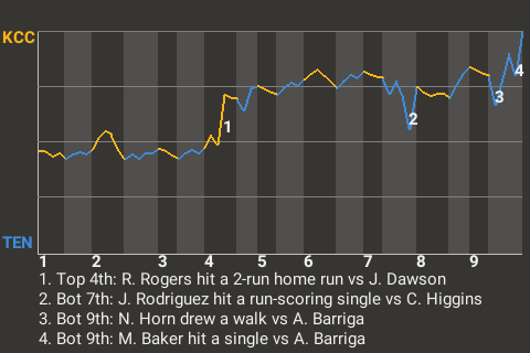 The Kansas City Chiefs picked up a win at The Coliseum, courtesy of Corey Higgins. The left-hander helped his team stop the Tennessee Titans, 2-1. The winner was Higgins. He threw 8.0 innings of 6-hit ball. The loser was Joaquin Dawson. Tennessee falls to 8-10.