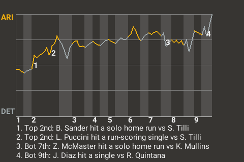 The Arizona Cardinals beat the Detroit Lions, 3-2, at Ford Field. Willie Chediak, who is tied for 9th in the NBC in doubles with 7, starred for Arizona. He was 4 for 4 with a double and 3 singles. The Lions continue "in the red" at 8-13.