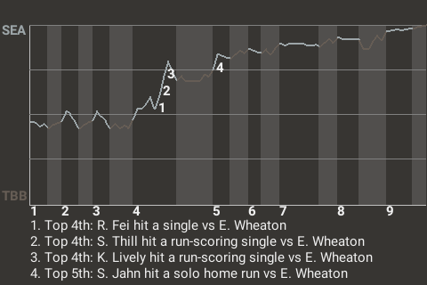 With Seattle leading 1-0 in the top of the fourth, Lively hit a run-scoring single off Tampa Bay hurler Eric Wheaton. It was the 5th hit of the season for Lively and put his team ahead, 2-0.