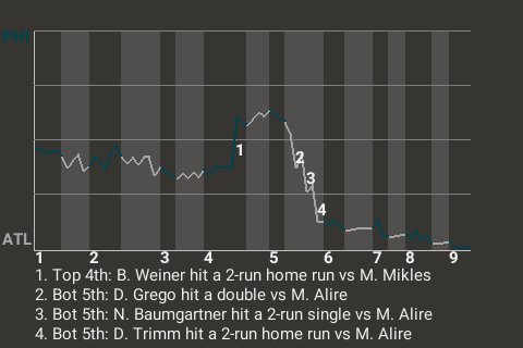 With Atlanta trailing 3-2 in the bottom of the fifth, Baumgartner hit a 2-run single off Philadelphia hurler Manny Alire. It was the 20th hit of the season for Baumgartner and put his team ahead, 4-3.