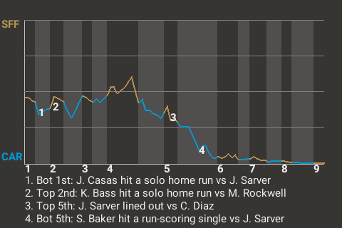 The Panthers had to work out of trouble in the top of the sixth. The score was 6-1, Carolina, with two out. San Francisco, with the bases loaded, was mounting a threat. Adam Tilton dug in at the plate, but on a 0-1 fastball, he grounded out.