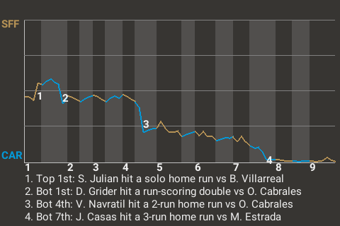 The Panthers got a big at-bat from first baseman Vladimir Navratil. For the game, Navratil was 1 for 3 with a home run and a walk, while adding 2 RBI and scoring once. In the bottom of the fourth, with a runner on 1st, he stroked a 2-run home run. His 1st home run of the season gave Carolina a 3-1 lead.