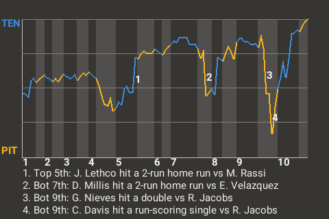 The Tennessee Titans topped the Pittsburgh Steelers, 7-5, in 10 innings. Tennessee right fielder Jimmy Lethco, in particular, was impressive. He was 3-4 with 2 home runs and a walk. He scored 3 runs and drove in 3. The win went to Randy Jacobs in relief. His record improves to 1-0. Bryant Lecaros took the loss. Tennessee goes to 10-11.