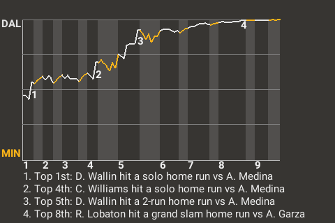 With Dallas leading 6-1 in the top of the eighth, Lobaton came up to bat against Minnesota pitcher Alfredo Garza. Lobaton hit a fastball to center for a grand slam home run. His 10th home run of the season put the Cowboys on top, 10-1.