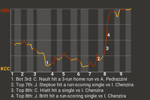 The game was at a stalemate until center fielder Mike Blakney came to bat in the top of the eighth. Facing Kansas City pitcher Idir Chenzira, he hit a first pitch sinker for a run-scoring single. It was a game-changer, putting Denver on top, 6-5.