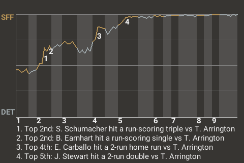 The San Francisco 49ers picked up a win at Ford Field, knocking off the Detroit Lions, 7-2. Starting pitcher Bobby Earnhart was a big reason why. Earnhart picked up the win for San Francisco, going 6.2 innings. He gave up 1 run on 6 hits. He now sports a record of 2-1. With this game in the books, San Francisco is 16-17, Detroit 15-18.