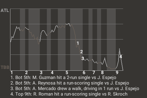 Alberto Mercado had a key at-bat with two out in the bottom of the fifth for Tampa Bay. With the bases loaded and the Buccaneers leading 5-4, he drew a walk, driving in 1 run.