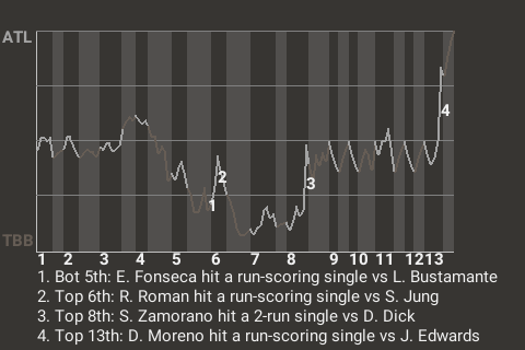The performance of Sergio Zamorano proved critical in helping Atlanta beat Tampa Bay, 6-5, in 13 innings. The Falcons right fielder was 3 for 4 with 3 singles and 3 walks, while adding 3 RBI. Chris Maria earned the win after being brought in from the bullpen. The right-hander allowed no runs on 2 hits in 3 innings. His record is now 1-0. After today's action, Atlanta sits at 13-20, while Tampa Bay falls to 14-19.