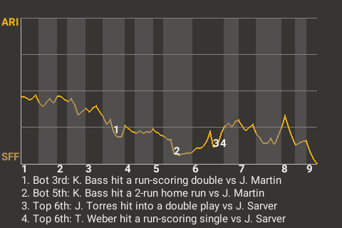 With San Francisco leading 2-0 in the bottom of the fifth, Bass hit a sinker from Josh Martin for a 2-run home run. It was his 6th home run of the season and put the 49ers ahead, 4-0.