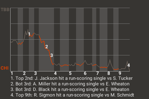 Shemar Moncrief drove in one run for Chicago. The 28-year old first baseman had a key at-bat in the bottom of the third. With one out and the bases loaded, he broke a 1-1 tie with a run-scoring ground out off Eric Wheaton. It was his 29th RBI of the season.