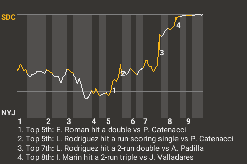 Rodriguez had a game-changing double in the top of the seventh. On a 1-2 curveball from Alfredo Padilla, he banged a 2-run double to center, giving the Chargers a 4-2 lead. It was the 8th double of the year for Rodriguez.