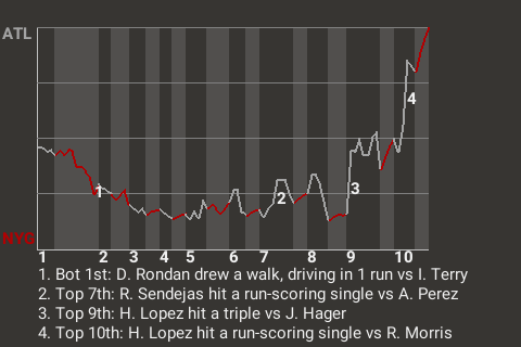 The Atlanta Falcons faced a tough opponent in New York pitcher Alex Perez, but found a way to pull out the victory at Giants Stadium by a final score of 4-3 in 10 innings. Perez went 7.2 innings and allowed 2 runs. New York is still trying to get off the schneid, having lost 6 in a row.