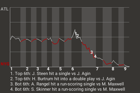New York center fielder Andres Rangel helped the Giants go up, 1-0, in the bottom of the sixth inning. With the game tied, Rangel hit a run-scoring single off Atlanta pitcher Matt Maxwell.