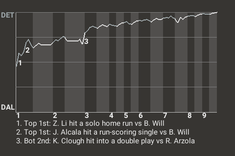 The Lions got a big at-bat from center fielder Zhang-sung Li. For the game, Li was 1-5 with a home run. He drove in 2 runs and scored once. In the top of the first, with the bases empty, he stroked a solo home run. His 3rd home run of the season gave Detroit a 1-0 lead.