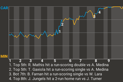 Carolina catcher Tony Gaxiola contributed a timely at-bat in the top of the fifth. With two down, he hit a changeup to center field for a run-scoring single. It was his 28th hit of the season and put the Panthers ahead, 2-0.