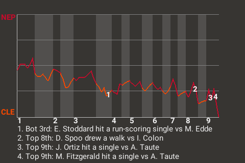 With scoring opportunities rare, the Browns had to cash in when they had the chance. One such opportunity presented itself in the bottom of the third, when catcher Eric Stoddard hit a run-scoring single. The single came off Matt Edde and made the score 2-0, Browns. Stoddard was 1 for 4.