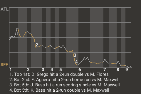 The 49ers got a big hit from right fielder Khalil Bass. Facing Atlanta pitcher Matt Maxwell in the bottom of the fifth, Bass pounded a 2-run double to right-center. His 20th double of the season put the 49ers ahead, 6-2.