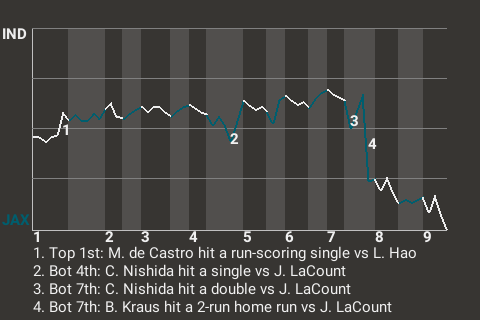 Jacksonville took a 2-1 lead on Ben Kraus's 1st home run of the season. The 2-run home run, which Kraus hit in the bottom of the seventh, left Indianapolis pitcher Jesse LaCount visibly frustrated.