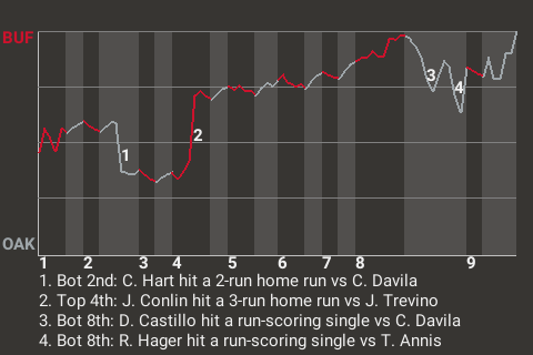 With Buffalo trailing 2-1 in the top of the fourth, Conlin hit a cutter from Jordan Trevino for a 3-run home run. It was his 1st home run of the season and put the Bills ahead, 4-2.