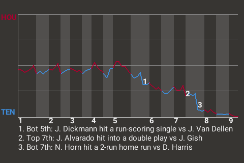 Tennessee went in front, 3-0, on Nick Horn's 2nd home run of the season. The 2-run home run, which Horn hit in the bottom of the seventh, left Houston pitcher Dennis Harris visibly perturbed.