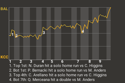 The Ravens got a big at-bat from center fielder Cesar Arellano. For the game, Arellano went 1 for 4 with a home run. In the top of the fourth, with the bases empty, he stroked a solo home run. His 6th home run of the season gave Baltimore a 2-1 lead.