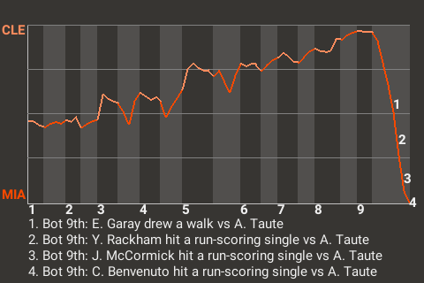 In the bottom of the ninth, with no one out and the game tied, 3-3, 23-year old right-handed pitcher C.J. Benvenuto won it for Miami. With the bases loaded, Benvenuto hit a 1-1 cutter from Adam Taute for a run-scoring single, giving his team the 4-3 win.