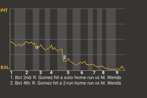 With Baltimore leading 1-0 in the bottom of the fourth, Gomez hit a fastball from Mike Wenda for a 2-run home run. It was his 5th home run of the season and put the Ravens ahead, 3-0.