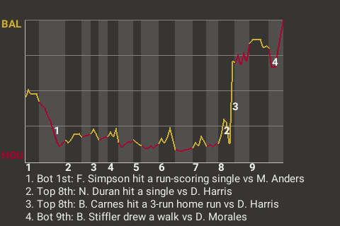 Carnes had a timely hit for Baltimore in the top of the eighth. With Baltimore trailing 4-2, he turned a 2-1 cutter into a 3-run home run. It was his 4th home run of the season, making it 5-4, Baltimore.