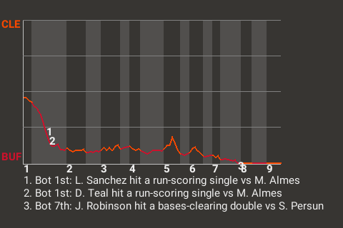 The Bills got a big hit from catcher Jamie Robinson. Facing Cleveland pitcher Sam Persun in the bottom of the seventh, Robinson pounded a bases-clearing double to left-center. His 3rd double of the season put the Bills ahead, 8-1.