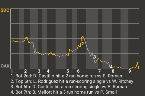 The 3-RBI night of right fielder Danny Castillo helped the Oakland Raiders triumph, 7-5, over the San Diego Chargers. Will Ritchey earned the win for Oakland. He lasted 6 innings, allowing 2 runs on 4 hits, while striking out 6. With the win, he raised his record to 6-1. Jesus Verdugo recorded the save for Oakland, his 5th of the season.