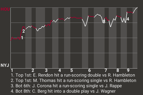 The Texans got a big at-bat from second baseman Edwin Rendon. For the game, Rendon was 2 for 3 with 2 doubles and a walk, while adding 2 RBI. In the top of the first, with runners on 1st and 2nd, he stroked a run-scoring double. His 9th double of the season gave Houston a 1-0 lead.