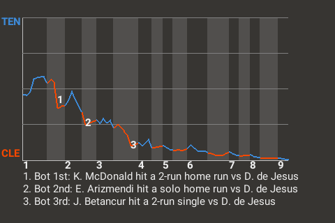 The Browns got a big at-bat from first baseman Kyle McDonald. For the game, McDonald went 1 for 3 with a home run and was hit by a pitch, while scoring 2 and driving in 2. In the bottom of the first, with a runner on 1st, he stroked a 2-run home run. His 2nd home run of the season gave Cleveland a 2-1 lead.