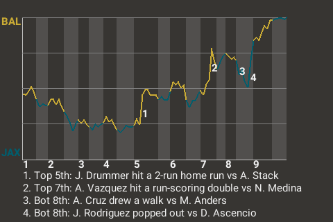 Who knows how it would've ended, had it not been for Alex Vazquez? The 28-year old catcher Vazquez stroked a run-scoring double in the top of the seventh inning to put Baltimore up, 3-2. For the game, he was 4 for 5, including 2 doubles and 2 singles.