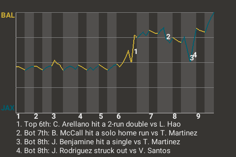 The Jacksonville Jaguars got a superb performance from pitcher Liang Hao, but the Baltimore Ravens still won the game, 2-1. Hao threw 7.0 innings of 4-hit ball. Baltimore pitcher Trystão Martinez earned the win, hiking his record to 2-3. Liang Hao suffered the loss. Earning his 12th save for Baltimore was David Morales.