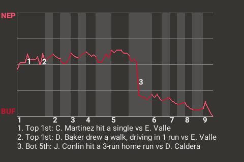 The Bills got a big at-bat from pinch hitter Joe Conlin. For the game, Conlin was 1 for 1 with a home run. He drove in 3 runs and scored once. In the bottom of the fifth, with runners on 1st and 2nd, he stroked a 3-run home run. His 2nd home run of the season gave Buffalo a 3-1 lead.