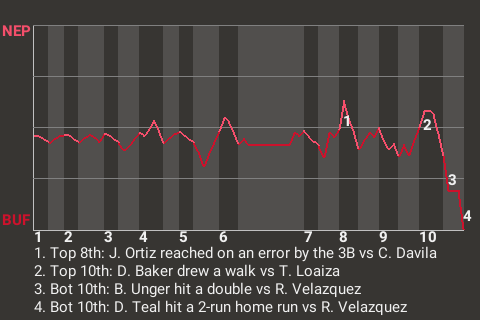Buffalo got a knockout punch from Dustin Teal. The right fielder hammered a 2-run home run in the bottom of the tenth inning to win the game. It might've been his only hit, but it decided the outcome.