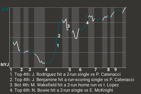 In the top of the sixth, Jacksonville pinch hitter Nate Bowie had a productive at-bat. With the bases loaded and two out, Bowie stroked a 2-run single to left-center. It made the score 10-7, Jacksonville. For the game, he went 1-1, while adding 2 RBI.