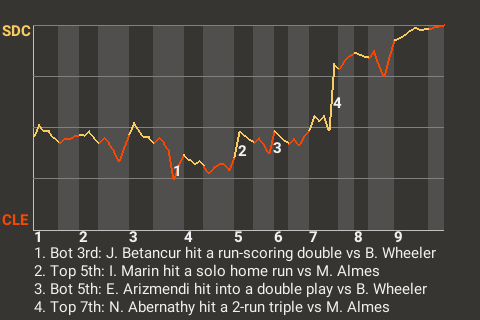 The Chargers grabbed a win, 5-1, at Cleveland Browns Stadium, overcoming a fine effort from Cleveland pitcher Mark Almes. Almes went 8 innings and allowed 3 runs. Bill Wheeler, the winning pitcher, improved to 3-4. He pitched 7.1 innings, giving up 10 hits and 1 run, while striking out 5 and walking 1. San Diego now has a record of 23-19 with the win.