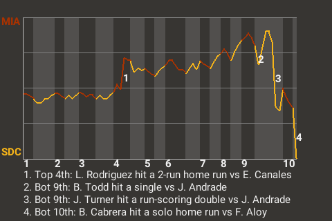 San Diego got a knockout punch from Bernie Cabrera. The pinch hitter hammered a solo home run in the bottom of the tenth inning to win the game. It might've been his only hit, but it decided the outcome.