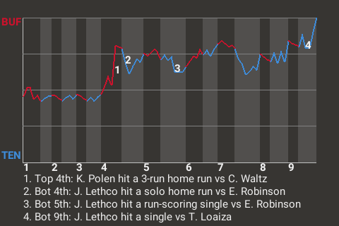 Buffalo used a clutch at-bat from Kelly Polen to capture the win. The catcher hammered a 3-run home run in the top of the fourth inning to put the Bills ahead, 3-0. It was his lone hit in 4 at-bats, but it was a humdinger.