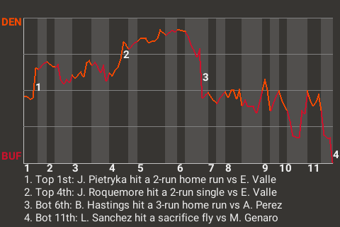 The clutch at-bat came in the bottom of the 11th inning, when Buffalo first baseman Leo Sanchez, facing Manny Genaro, had a run-scoring sacrifice fly. It gave the Bills the 7-6 win.