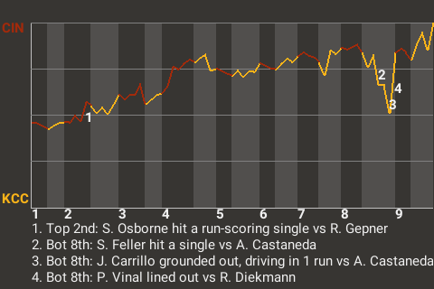Cincinnati Bengals starter Alex Castaneda was in the groove. He led his team to a win over the Kansas City Chiefs, 3-2. In 7.1 innings, Castaneda surrendered 8 hits, while striking out 2 and walking 0. He allowed 2 runs. Rich Muldoon earned the save for Cincinnati, his 11th.