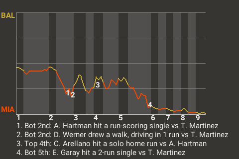 Miami starter Allen Hartman kept the Baltimore offense from doing much damage. The right-hander leaned on his circle change in leading the Dolphins to a 5-1 win. Hartman got the win, improving to 3-1. He gave up 4 hits and walked 2 over 8 innings. He allowed 1 run. Miami goes to 29-19, Baltimore to 26-22.