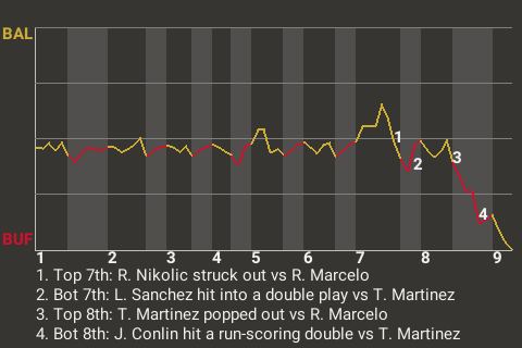 Buffalo took a 1-0 lead on Joe Conlin's 6th double of the season. The run-scoring double, which Conlin hit in the bottom of the eighth, left Baltimore pitcher Trystão Martinez visibly frustrated.