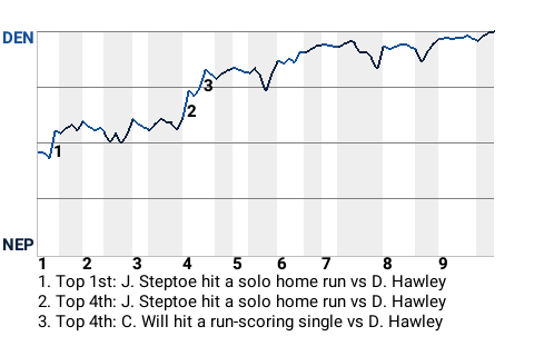 With Denver leading 1-0 in the top of the fourth, Steptoe hit a slider from Dave Hawley for a solo home run. It was his 2nd home run of the season and put the Broncos ahead, 2-0.