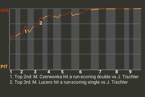 3 (6, 1st Inning off J. Tischler, 0 on, 0 outs; 6th Inning off D. Lupi, 1 on, 1 out; 7th Inning off D. Lupi, 1 on, 2 outs)