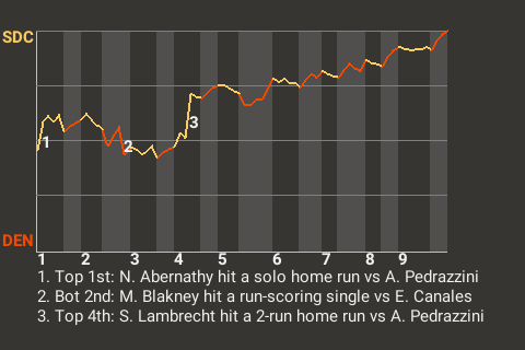 San Diego used the hitting of Stephen Lambrecht to pick up the win. The second baseman clubbed a 2-run home run in the top of the fourth inning to put the Chargers on top, 3-1. For the game, Lambrecht had 1 home run and 1 single in 4 at-bats.
